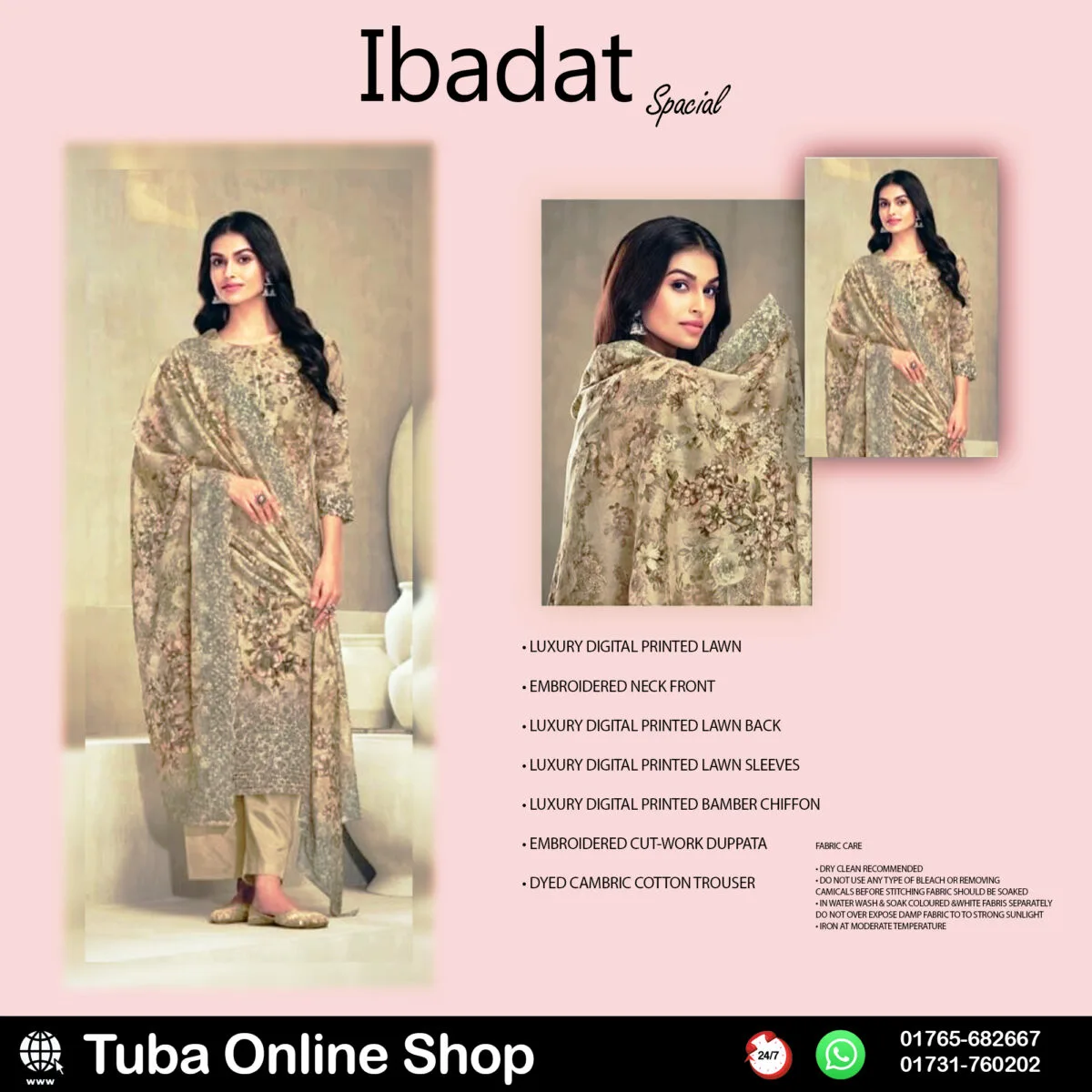 • প্রিমিয়াম ইবাদাত ডিজিটাল প্রিন্টেড লোন এমব্রয়ডারি থ্রী-পিস